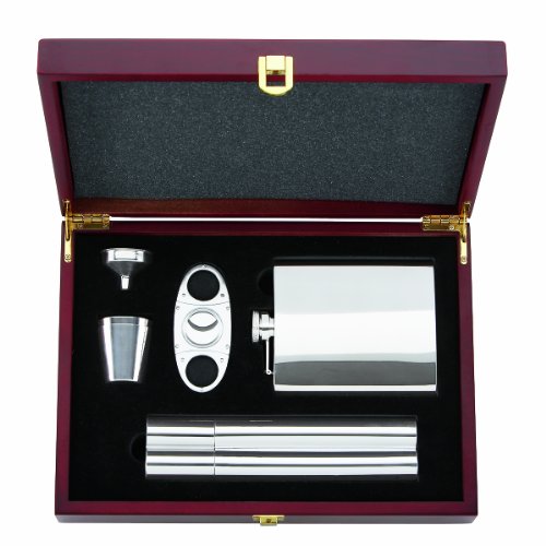 - Includes hip flask, funnel, cup, dual cigar tube, cigar cutter and wooden gift box